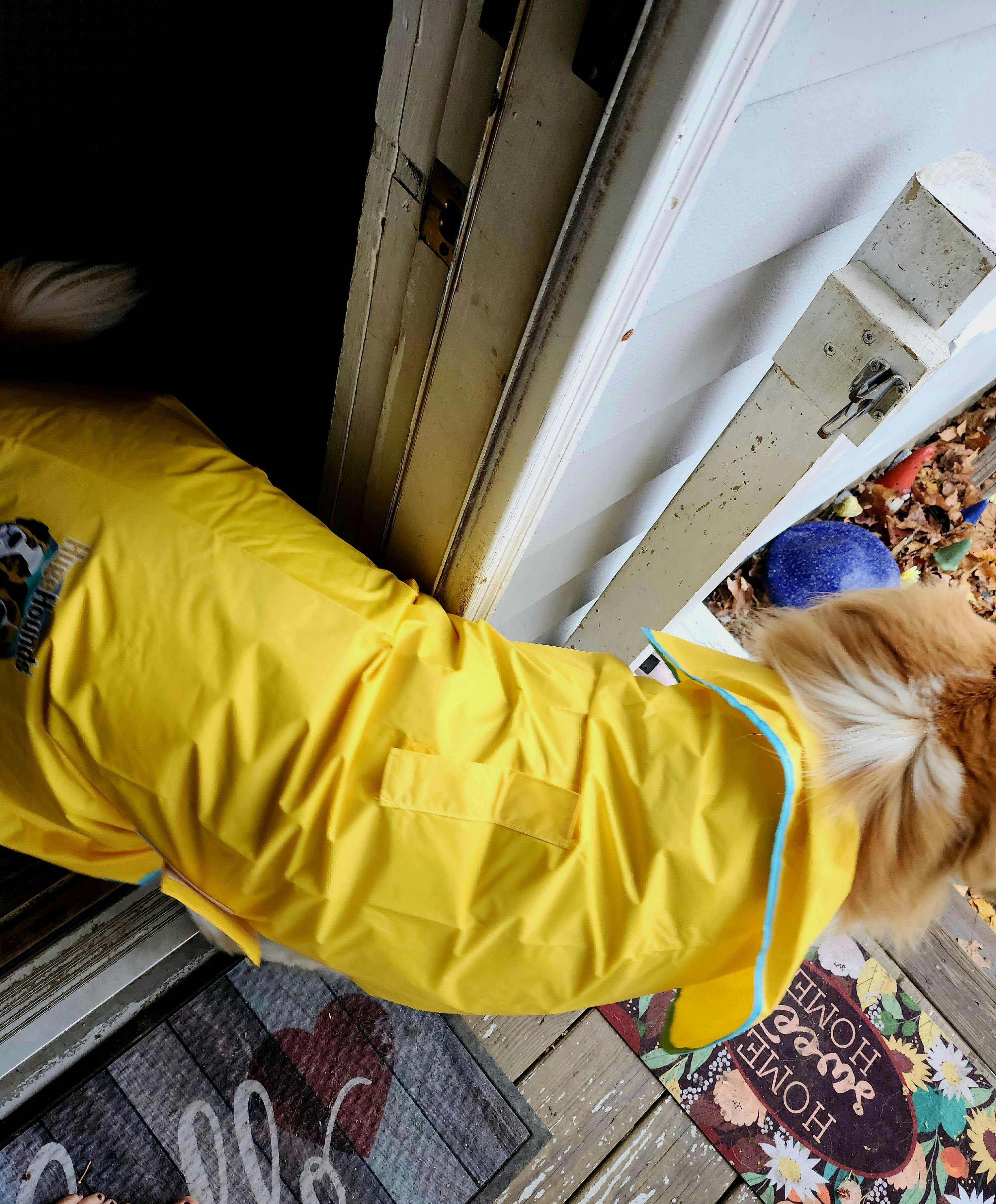 This raincoat is just the right size for our huge hound! He didn’t complain about wearing it and it kept the covered parts dry on our rainy walk this morning. Now if we could only get him rain boots! 😂